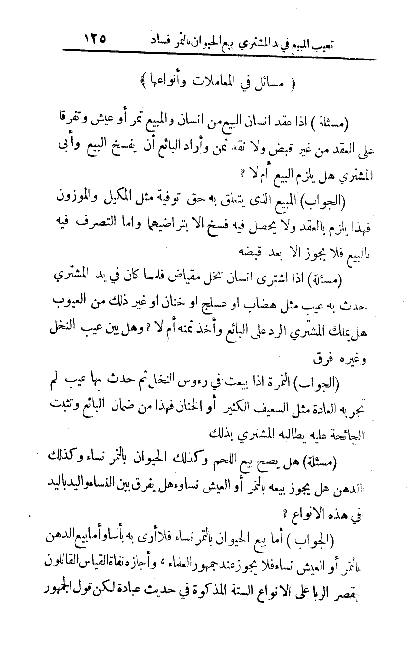 (الجواب): أما بيع الحيوان بالتمر نساء فلا أرى به بأسا، وأما بيع الدهن بالتمر أو العيش نساء فلا يجوز عند جمهور العلماء؛ وأجازه نفاة القياس القائلون بقصر الربا على الأنواع الستة المذكورة في حديث عبادة، لكن قول الجمهور