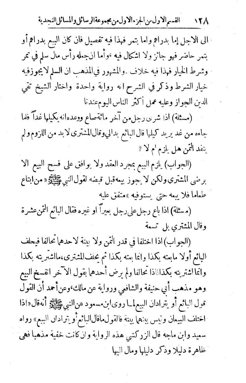 (الجواب): إذا اختلفا في قدر الثمن ولا بينة لأحدهما، تحالفا: فيحلف البائع أولا: ما بعته بكذا وإنما بعته بكذا، ثم يحلف المشتري: ما اشتريته بكذا وإنما اشتريته بكذا. فإذا تحالفا ولم يرض أحدهما بقول الآخر انفسخ البيع؛ وهو مذهب أبي حنيفة والشافعي ورواية عن مالك، وعن أحمد أن القول قول البائع، أو يترادان البيع، لما روى ابن مسعود عن النبي صلى الله عليه وسلم أنه قال: "إذا اختلف البيعان وليس بينهما بينة فالقول ما قال البائع، أو يترادان البيع"2 رواه سعيد وابن ماجه. قال الزركشي: هذه الرواية وإن كانت خفية مذهبا، فهي ظاهرة دليلا، وذكر دليلها ومال إليها.