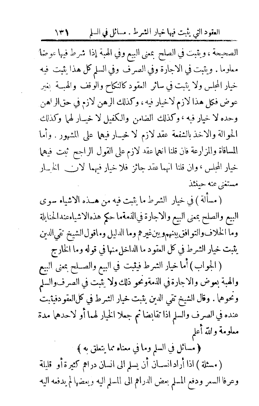 (الجواب): أما خيار الشرط فيثبت في البيع، والصلح بمعنى البيع، والهبة بعوض، والإجارة في الذمة، ونحو ذلك، ولا يثبت في الصرف والسلم ونحوهما. وقال الشيخ تقي الدين: يثبت خيار الشرط في كل العقود، فيثبت عنده في الصرف والسلم، إذا تقابضا، ثم جعلا الخيار لهما أو لأحدهما مدة معلومة، والله أعلم.