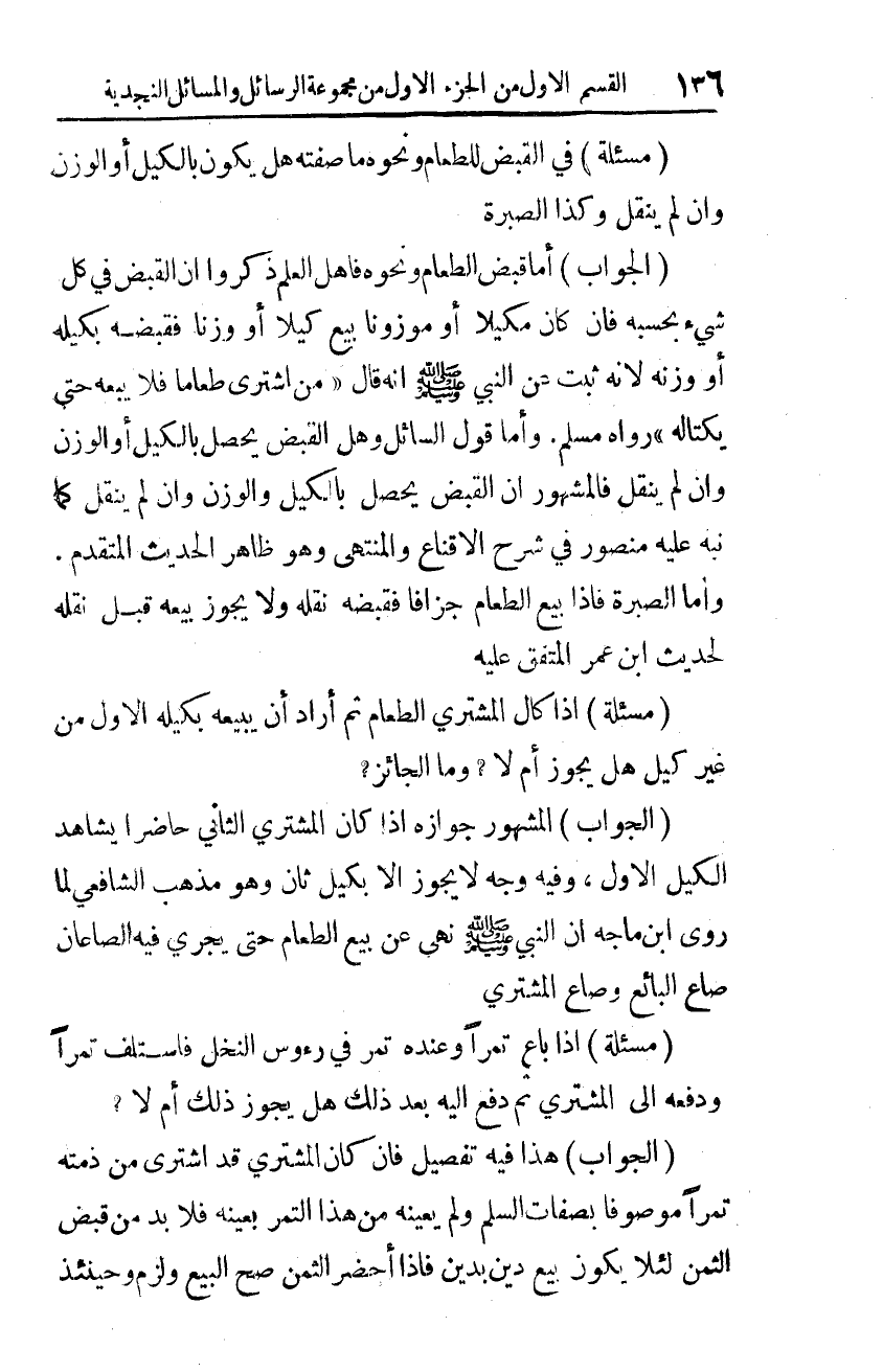 (الجواب): أما قبض الطعام ونحوه، فأهل العلم ذكروا أن القبض في كل شيء بحسبه، فإن كان مكيلا أو موزونا بيع كيلا أو وزنا فقبضه بكيله أو وزنه، لأنه ثبت عن النبي صلى الله عليه وسلم أنه قال: "من اشترى طعاما فلا يبعه حتى يكتاله"1 رواه مسلم.