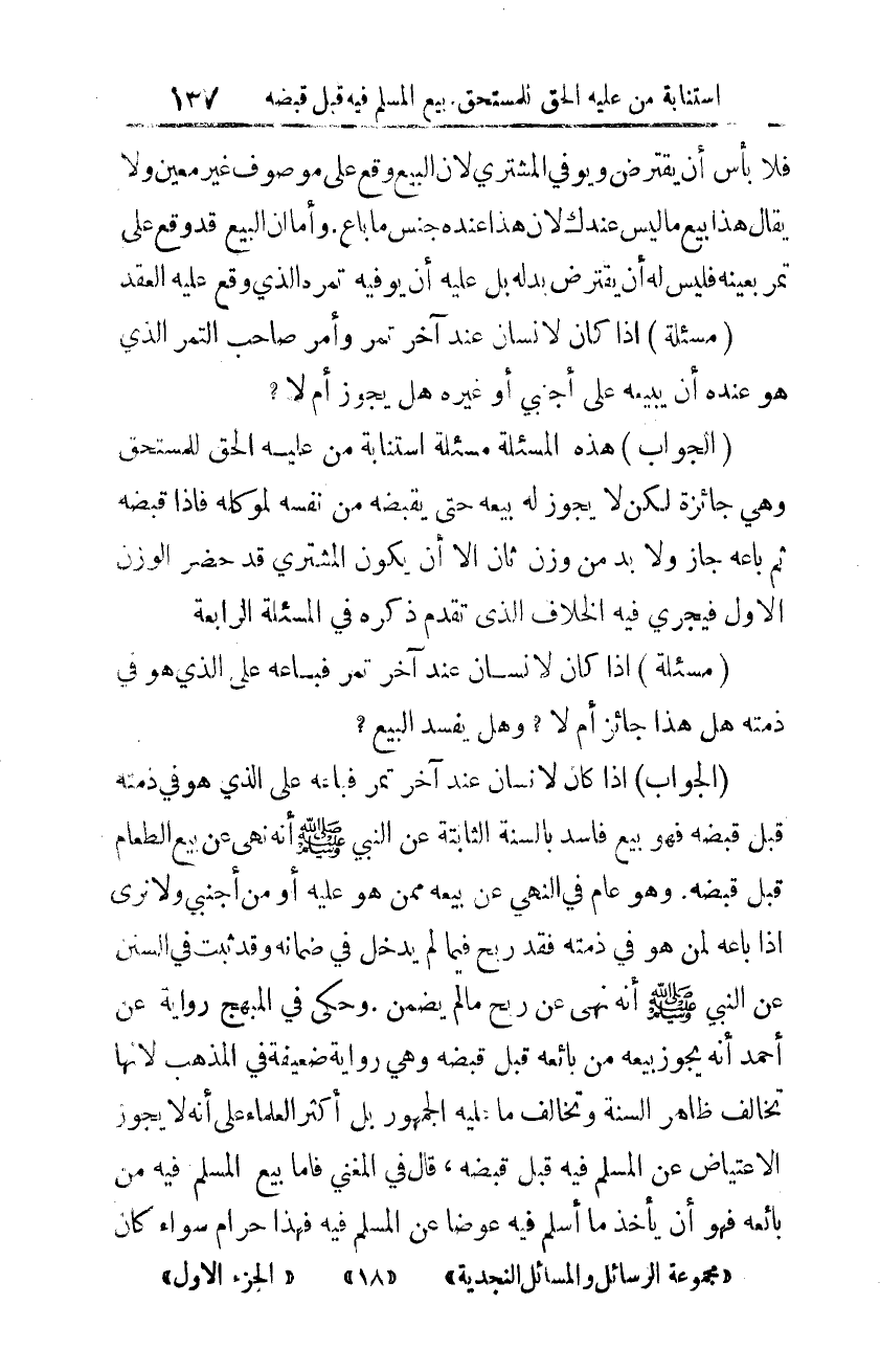 (الجواب): هذه المسألة مسألة استنابة من عليه الحق للمستحق وهي جائزة، لكن لا يجوز له بيعه حتى يقبضه من نفسه لموكله، فإذا قبضه ثم باعه جاز، ولا بد من وزن ثان، إلا أن يكون المشتري قد حضر الوزن الأول، فيجري فيه الخلاف الذي تقدم ذكره في المسألة الرابعة.
