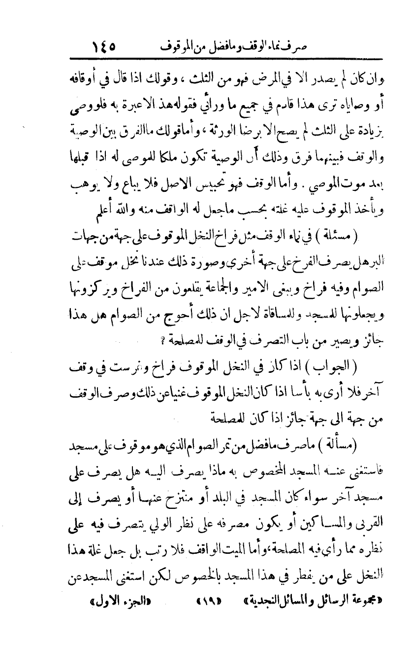 (مسألة): ما صرف ما فضل من تمر الصوام، الذي هو موقوف على مسجد فاستغنى عنه المسجد المخصوص به، ماذا يصرف إليه هل يصرف على مسجد آخر، سواء كان المسجد في البلد أو منتزح عنها؟ أو يصرف إلى القربى والمساكين أو يكون مصرفه على نظر الولي يتصرف فيه على نظره مما رأى فيه المصلحة، وأما الميت الواقف فلا رتب، بل جعل غلة هذا النخل على من يفطر في هذا المسجد بالخصوص، لكن استغنى المسجد عن