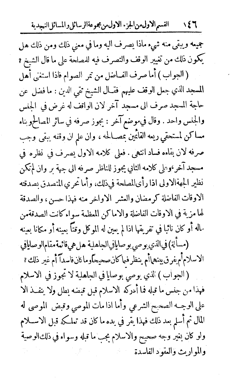 (الجواب): أما صرف الفاضل من تمر الصوام، فإذا استغنى أهل المسجد الذي جعل الوقف عليهم فقال الشيخ تقي الدين: ما فضل عن حاجة المسجد صرف إلى مسجد آخر، لأن الواقف له غرض في الجنس، والجنس واحد. وقال في موضع آخر: يجوز صرفه، في سائر المصالح، وبناء مساكن لمستحقي ريعه القائمين بمصالحه، وإن علم أن وقفه يبقى وجب صرفه، لأن بقاءه فساد. انتهى.