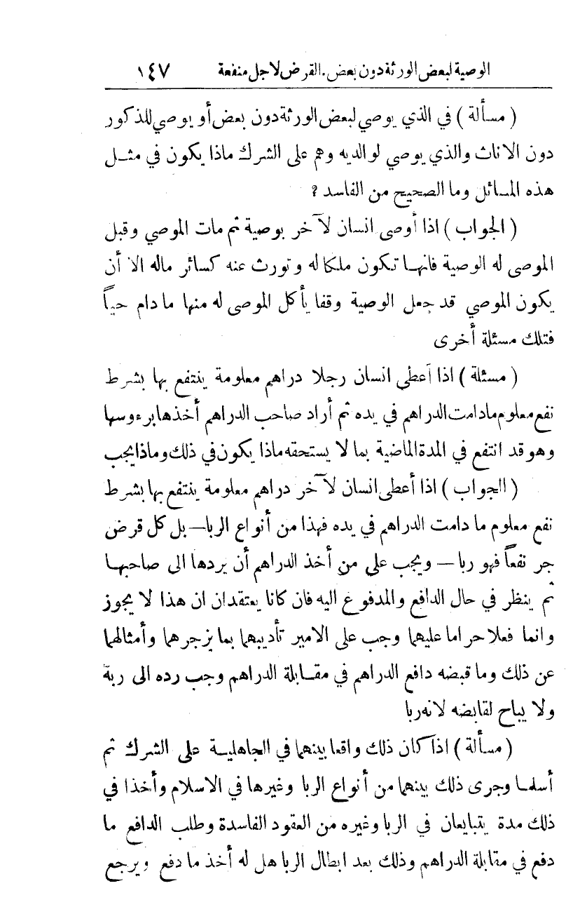 (الجواب): إذا أعطى إنسان لآخر دراهم معلومة ينتفع بها بشرط نفع معلوم ما دامت الدراهم في يده، فهذا من أنواع الربا -بل كل قرض جر نفعا فهو ربا-، ويجب على من أخذ الدراهم أن يردها إلى صاحبها. ثم ينظر في حال الدافع والمدفوع إليه، فإن كانا يعتقدان أن هذا لا يجوز، وإنما فعلا حراما عليهما وجب على الأمير تأديبهما بما يزجرهما وأمثالهما عن ذلك، وما قبضه دافع الدراهم في مقابلة الدراهم وجب رده إلى ربه، ولا يباح لقابضه لأنه ربا.