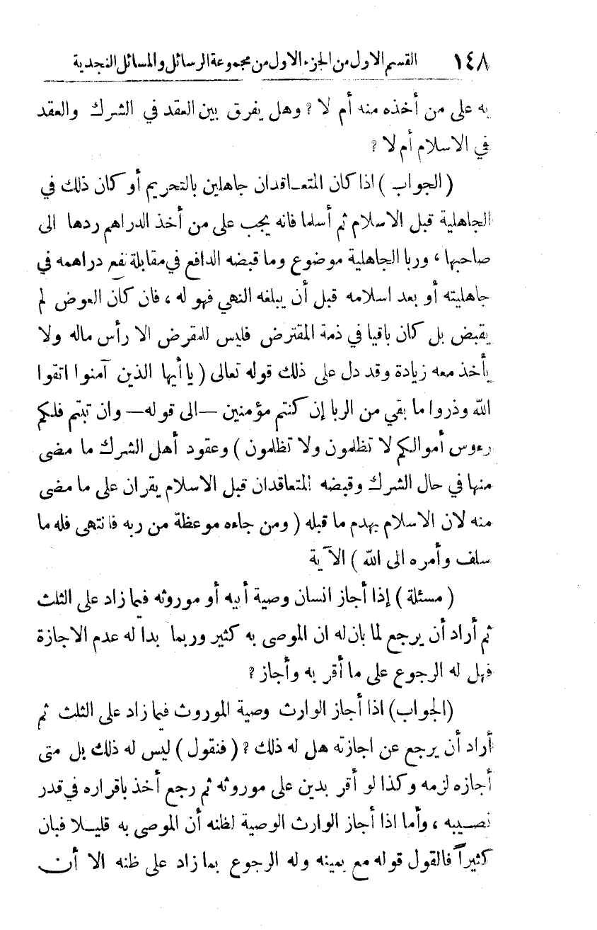 (الجواب): إذا كان المتعاقدان جاهلين بالتحريم، أو كان ذلك في الجاهلية قبل الإسلام ثم أسلما، فإنه يجب على من أخذ الدراهم ردها إلى صاحبها، وربا الجاهلية موضوع، وما قبضه الدافع في مقابلة نفع دراهمه في جاهليته أو بعد إسلامه قبل أن يبلغه النهي فهو له، فإن كان العوض لم يقبض، بل كان باقيا في ذمة المقترض، فليس للمقرض إلا رأس ماله، ولا يأخذ معه زيادة.