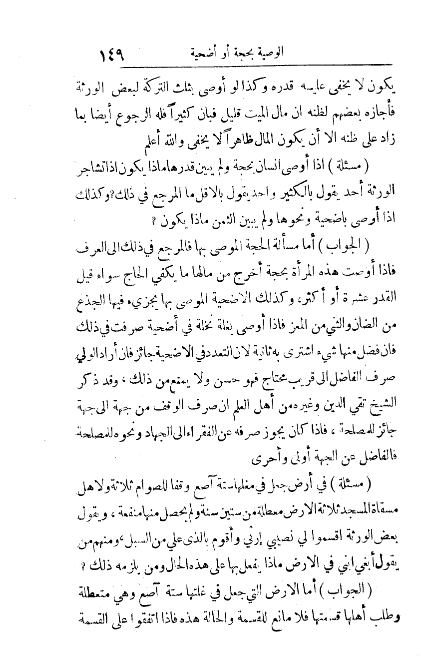 (الجواب): أما مسألة الحجة الموصى بها، فالمرجع في ذلك إلى العرف، فإذا أوصت هذه المرأة بحجة أخرج من مالها ما يكفي الحاج، سواء قيل القدر عشرة أو أكثر، وكذلك الأضحية الموصى بها يجزئ فيها الجذع من الضأن، والثني من المعز، فإذا أوصى بغلة نخل في أضحية صرفت في ذلك، فإن فضل منها شيء اشترى به ثانية، لأن التعدد في الأضحية جائز، فإن أراد الولي صرف الفاضل إلى قريب محتاج فهو حسن، ولا يمنع من ذلك. وقد ذكر الشيخ تقي الدين وغيره من أهل العلم: أن صرف الوقف من جهة إلى جهة جائز للمصلحة، فإذا كان يجوز صرفه عن الفقراء إلى الجهاد ونحوه للمصلحة، فالفاضل عن الجهة أولى وأحرى.