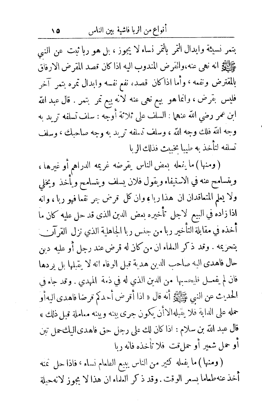 بتمر نسيئة، وإبدال التمر بالتمر نساء لا يجوز؛ بل هو ربا ثبت عن النبي صلى الله عليه وسلم أنه نهى عنه. والقرض المندوب إليه إذا كان قصد المُقْرِض الإرفاق بالمُقْتَرِض ونفعه، وأما إذا كان قصده نفع نفسه، وإبدال تمره بتمر آخر، فليس بقرض؛ وإنما هو بيع نُهي عنه، لأنه بيع تمر بتمر. قال عبد الله بن عمر -رضي الله عنهما-: السلف على ثلاثة أوجه: سلف تسلفه تريد به وجه الله، فلك وجه الله، وسلف تسلفه تريد به وجه صاحبك، وسلف تسلفه لتأخذ به طيبا بخبيث، فذلك الربا.