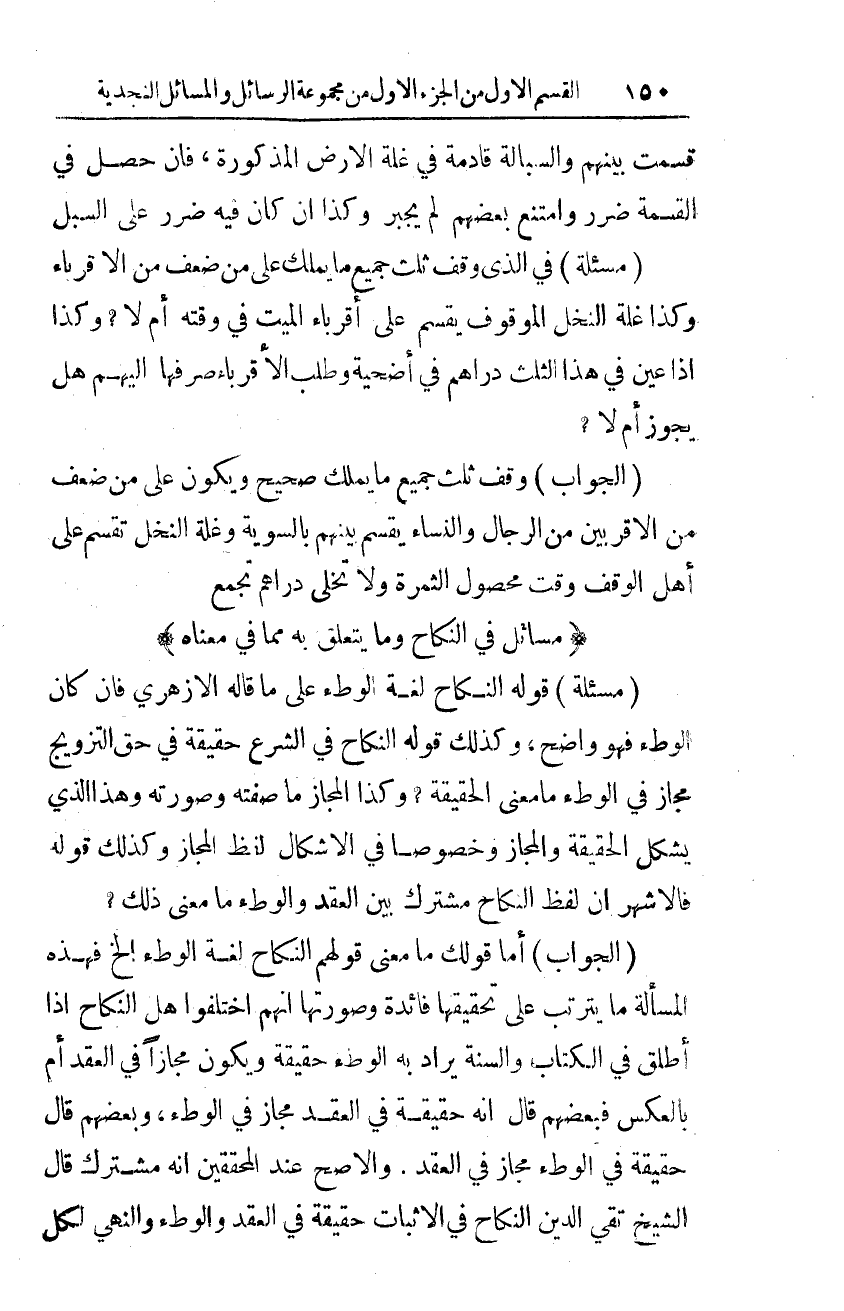 (الجواب): أما قولك: ما معنى قولهم النكاح لغة: الوطء الخ. فهذه المسألة ما يترتب على تحقيقها فائدة، وصورتها أنهم اختلفوا هل النكاح إذا أطلق في الكتاب والسنة يراد به الوطء حقيقة ويكون مجازًا في العقد، أم بالعكس فبعضهم قال: إنه حقيقة في العقد مجاز في الوطء، وبعضهم قال: حقيقة في الوطء مجاز في العقد. والأصح عند المحققين أنه مشترك، قال الشيخ تقي الدين: النكاح في الإثبات حقيقة في العقد والوطء والنهي لكل