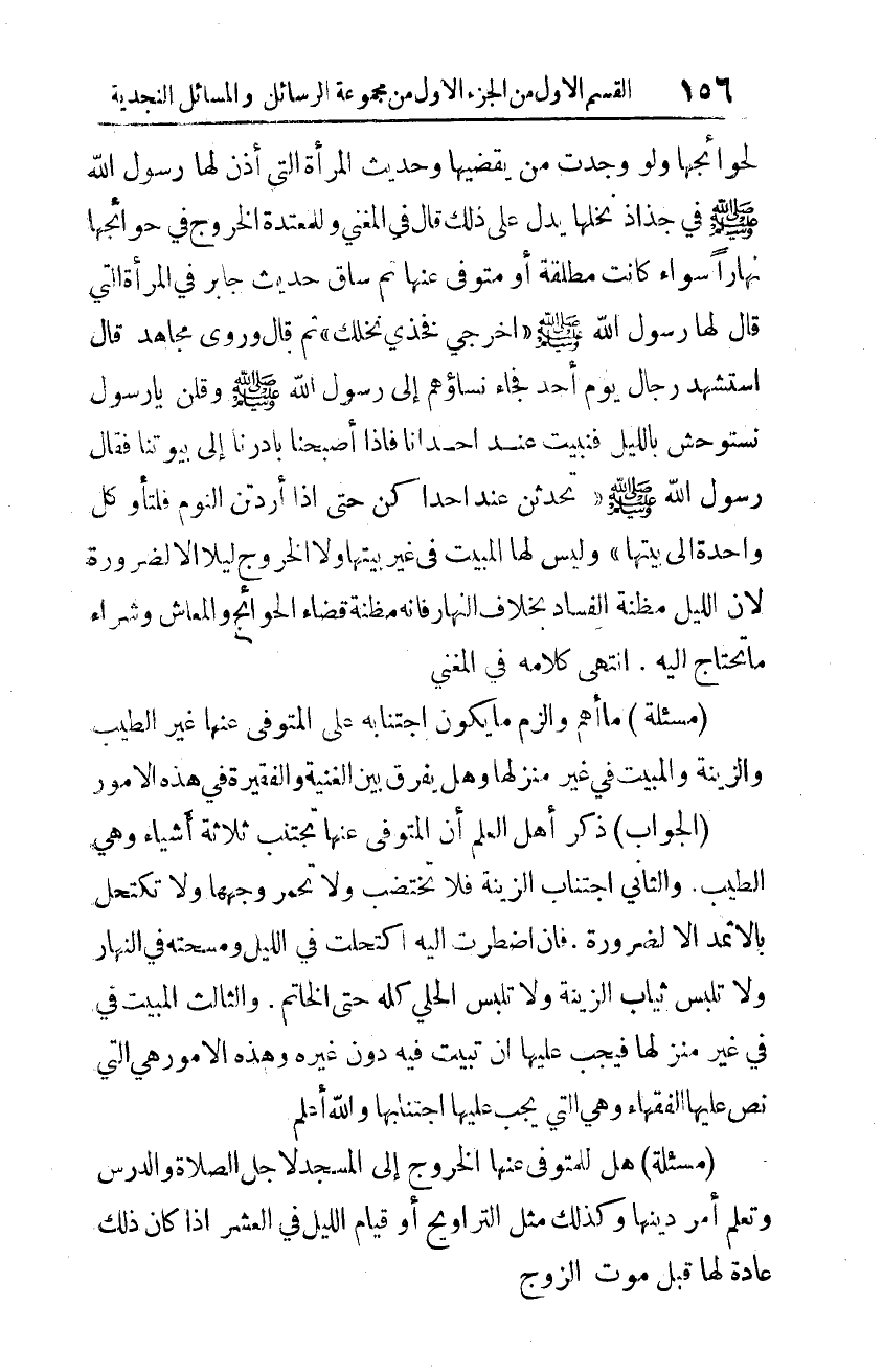 (مسألة): هل للمتوفى عنها الخروج إلى المسجد، لأجل الصلاة والدرس وتعلم أمر دينها، وكذلك مثل التراويح، أو قيام الليل في العشر، إذا كان ذلك عادة لها قبل موت الزوج