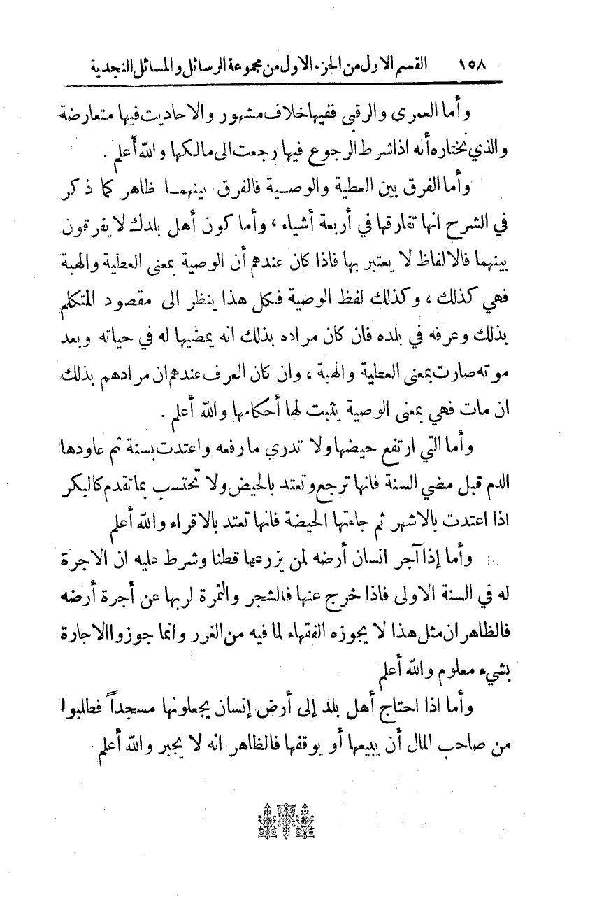 وأما الفرق بين العطية والوصية، فالفرق بينهما ظاهر كما ذكر في الشرح أنها تفارقها في أربعة أشياء. وأما كون أهل بلدك لا يفرقون بينهما فالألفاظ لا يعتبر بها. فإذا كان عندهم أن الوصية بمعنى العطية والهبة فهي كذلك، وكذلك لفظ الوصية. فكل هذا ينظر إلى مقصود المتكلم بذلك وعرفه في بلده، فإن كان مراده بذلك أنه يمضيها له في حياته، وبعد موته صارت بمعنى العطية والهبة. وإن كان العرف عندهم، أن مرادهم بذلك: إن مات فهي بمعنى الوصية يثبت لها أحكامها، والله أعلم.