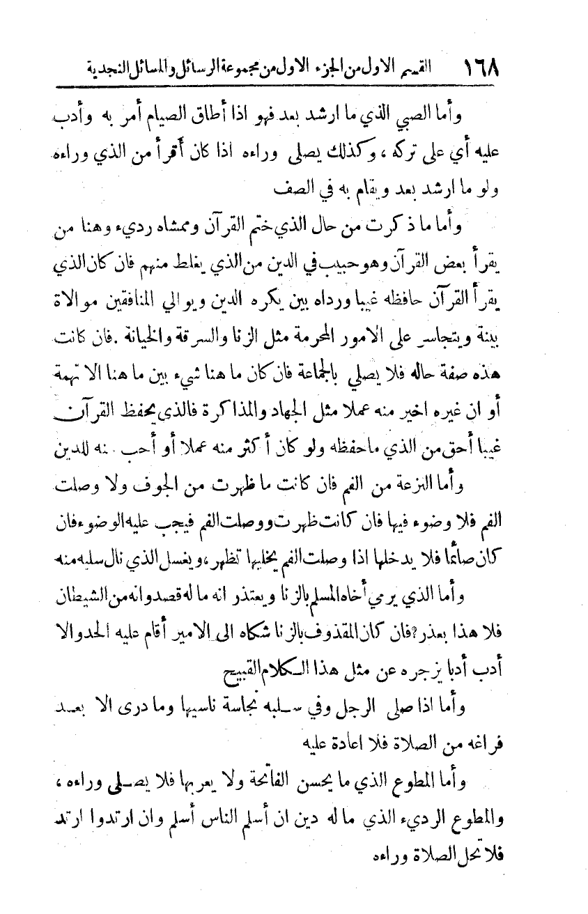 وأما المطوع الذي ما يحسن الفاتحة ولا يعربها، فلا يصلى وراءه، والمطوع الرديء الذي ما له دين إن أسلم الناس أسلم، وإن ارتدوا ارتد، فلا تحل الصلاة وراءه.