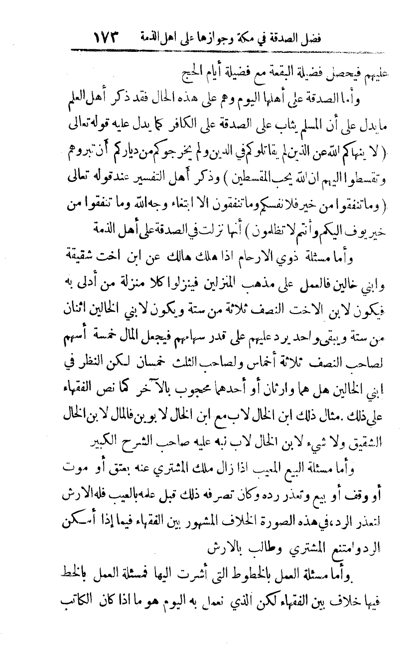 وأما مسألة ذوي الأرحام إذا هلك هالك عن ابن أخت شقيقة وابني خالين، فالعمل على مذهب المنْزلين، فينْزلوا كلا منْزلة من أدلى به: فيكون لابن الأخت النصف ثلاثة من ستة، ويكون لابني الخالين اثنان من ستة ويبقى واحد يرد عليهم على قدر سهامهم، فيجعل المال خمسة أسهم لصاحب النصف ثلاثة أخماس، ولصاحب الثلث خمسان. لكن النظر في ابني الخالين هل هما وارثان أو أحدهما محجوب بالآخر كما نص الفقهاء على ذلك. مثال ذلك ابن الخال لأب مع ابن الخال لأبوين، فالمال لابن الخال الشقيق، ولا شيء لابن الخال لأب، نبه عليه صاحب الشرح الكبير.