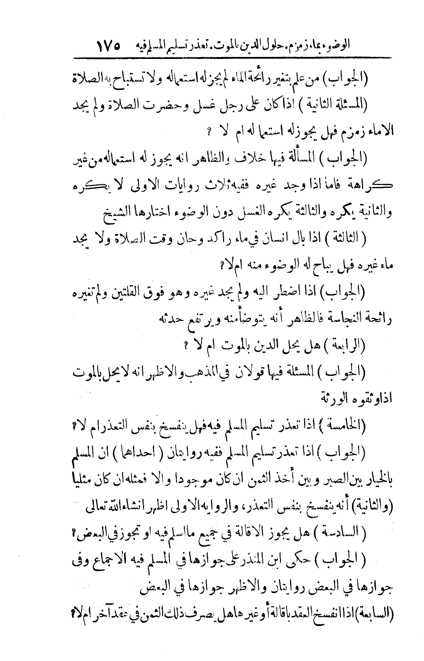 (الجواب): المسألة فيها خلاف، والظاهر أنه يجوز له استعماله من غير كراهة. فأما إذا وجد غيره ففيه ثلاث روايات: الأولى: لا يكره، والثانية: يكره، والثالثة: يكره الغسل دون الوضوء اختارها الشيخ.