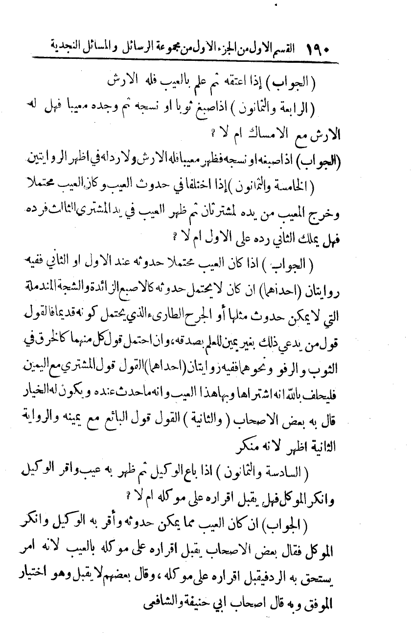 (الجواب): إن كان العيب مما يمكن حدوثه، وأقر به الوكيل وأنكر الموكل، فقال بعض الأصحاب يقبل إقراره على موكله بالعيب، لأنه أمر يستحق به الرد، فيقبل إقراره على موكله. وقال بعضهم: لا يقبل، وهو اختيار الموفق، وبه قال أصحاب أبي حنيفة والشافعي.