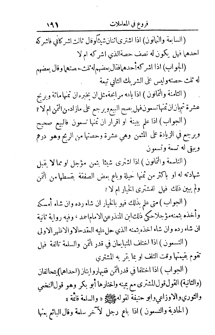 (الجواب): إذا علم ببينة أو إقرار أن ثمنها تسعون، فالبيع صحيح ويرجع في الزيادة على المثمن وهي عشرة وحصتها من الربح، وهو درهم ويبقى له تسعة وتسعون.