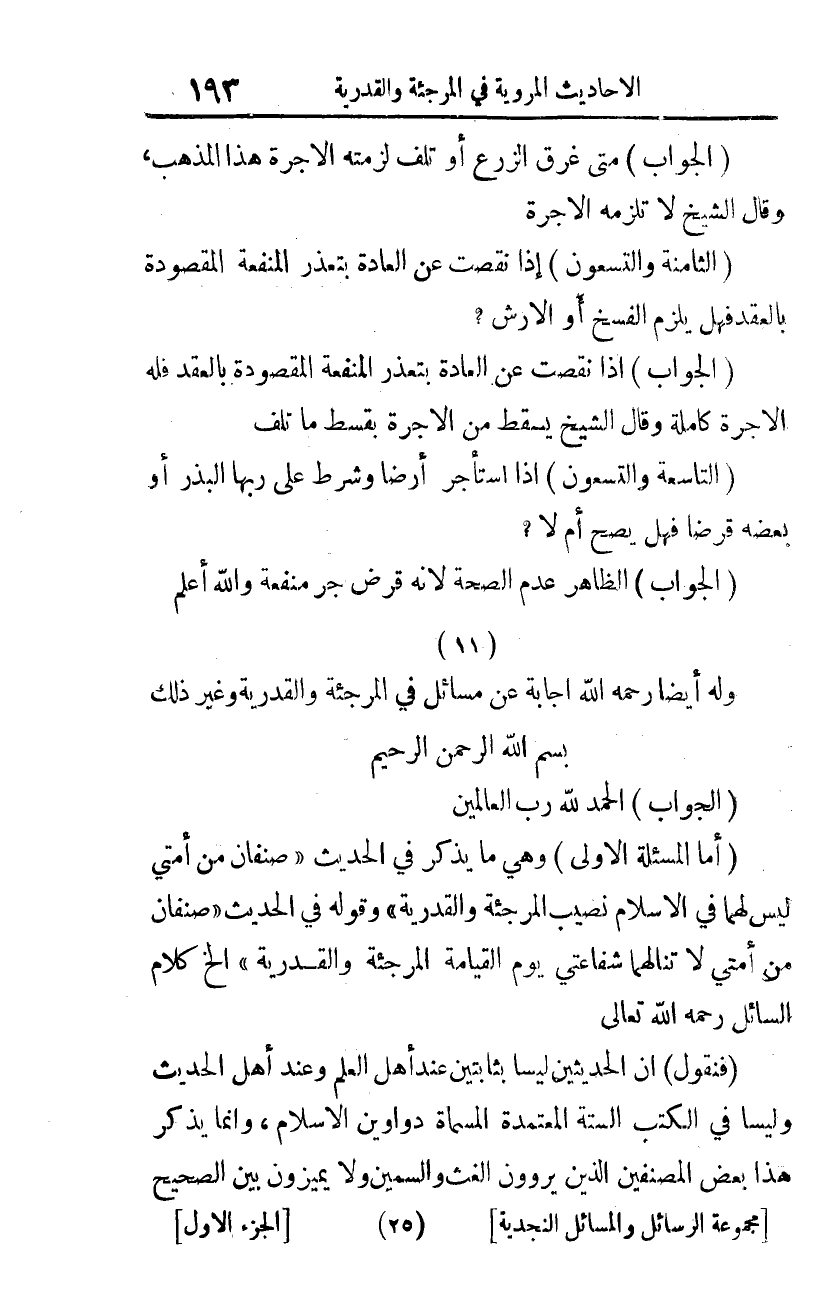 (أما المسألة الأولى): وهي ما يذكر في الحديث: "صنفان من أمتي ليس لهما في الإسلام نصيب: المرجئة والقدرية"1، وقوله في الحديث: "صنفان من أمتي لا تنالهما شفاعتي يوم القيامة: المرجئة والقدرية" إلخ كلام السائل -رحمه الله تعالى-.