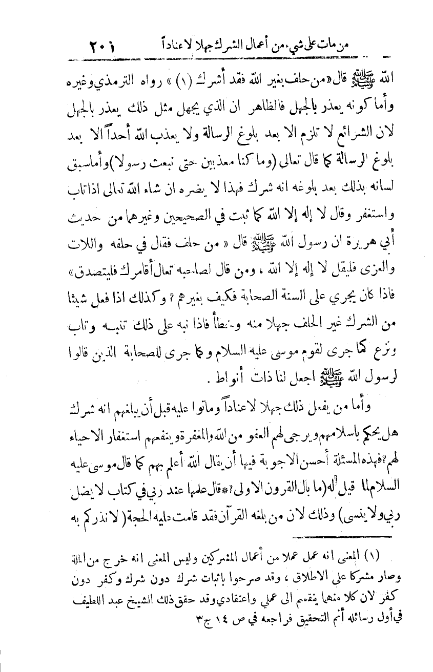 1 المعنى أنّه عمل عملًا من أعمال المشركين، وليس المعنى أنّه خرج من الملة، وصار مشركًا على الإطلاق، وقد صرحوا بإثبات شركٍ دون شركٍ، وكفرٍ دون كفرٍ؛ لأنّ كلًا منهما ينقسم إلى عملي واعتقادي، وقد حقّق ذلك الشّيخ عبد اللّطيف في أوّل رسائله أتم التّحقيق، فراجعه في 3/ 14.