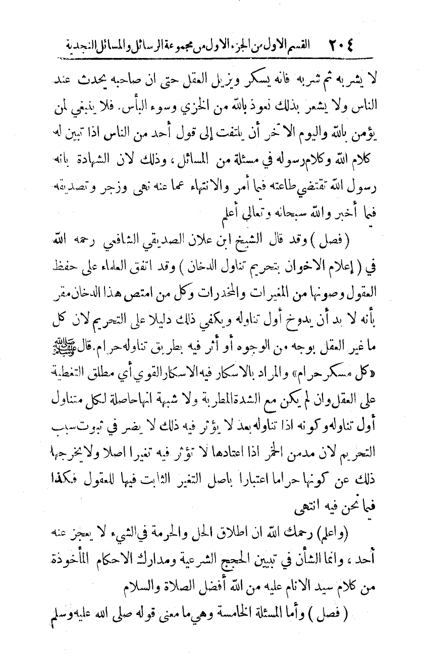 (فصل): وقد قال الشّيخ ابن علان الصّديقي الشّافعي -رحمه الله- في (إعلام الإخوان بتحريم تناول الدّخان): وقد اتّفق العلماء على حفظ العقول وصونها من المغيّرات والمخدّرات، وكلّ مَن امتصّ هذا الدّخان مقرّ بأنّه لا بدّ أن يدوخ أوّل تناوله ويكفي ذلك دليلًا على التّحريم؛ لأنّ كلّ ما غيّر العقل بوجهٍ من الوجوه أو أثّر فيه بطريق تناوله حرام. قال -صلّى الله عليه وسلّم-: "كلّ مسكرٍ حرام"، والمراد بالإسكار فيه الإسكار القويّ، أي: مطلق التّغطية على العقل، وإن لم يكن مع الشّدّة المطربة، ولا شبهة أنها حاصلة لكلّ متناولٍ أوَّلَ تناوله، وكونه إذا تناوله بعد لا يؤثّر فيه ذلك لا يضرّ في ثبوت سبب التّحريم؛ لأنّ مدمن الخمر إذا اعتادها لا تؤثّر فيه تغيّر أصلًا، ولا يخرجها ذلك عن كونها حرامًا اعتبارًا بأصل التّغيّر الثّابت فيها للعقول، فكذا فيما نحن فيه. انتهى.