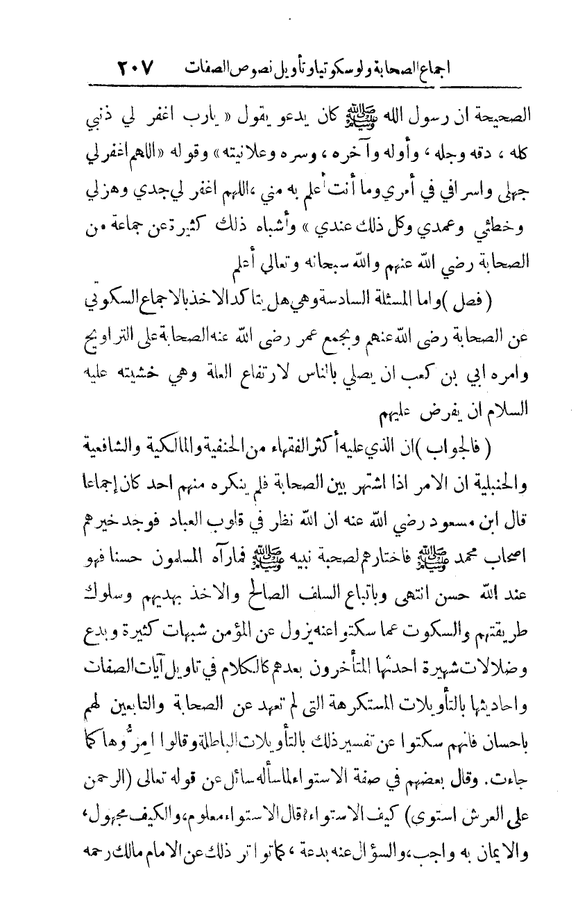 (فالجواب) أنّ الذي عليه أكثر الفقهاء من الحنفية والمالكية والشّافعية والحنبلية أنّ الأمر إذا اشتهر بين الصّحابة فلم ينكره منهم أحد كان إجماعًا، قال ابن مسعود -رضي الله عنه-: إنّ الله نظر في قلوب العباد فوجد خيرهم أصحاب محمّد -صلّى الله عليه وسلّم- فاختارهم لصحبة نبيّه -صلّى الله عليه وسلّم-، فما رآه المسلمون حسنًا فهو عند الله حسن. انتهى.