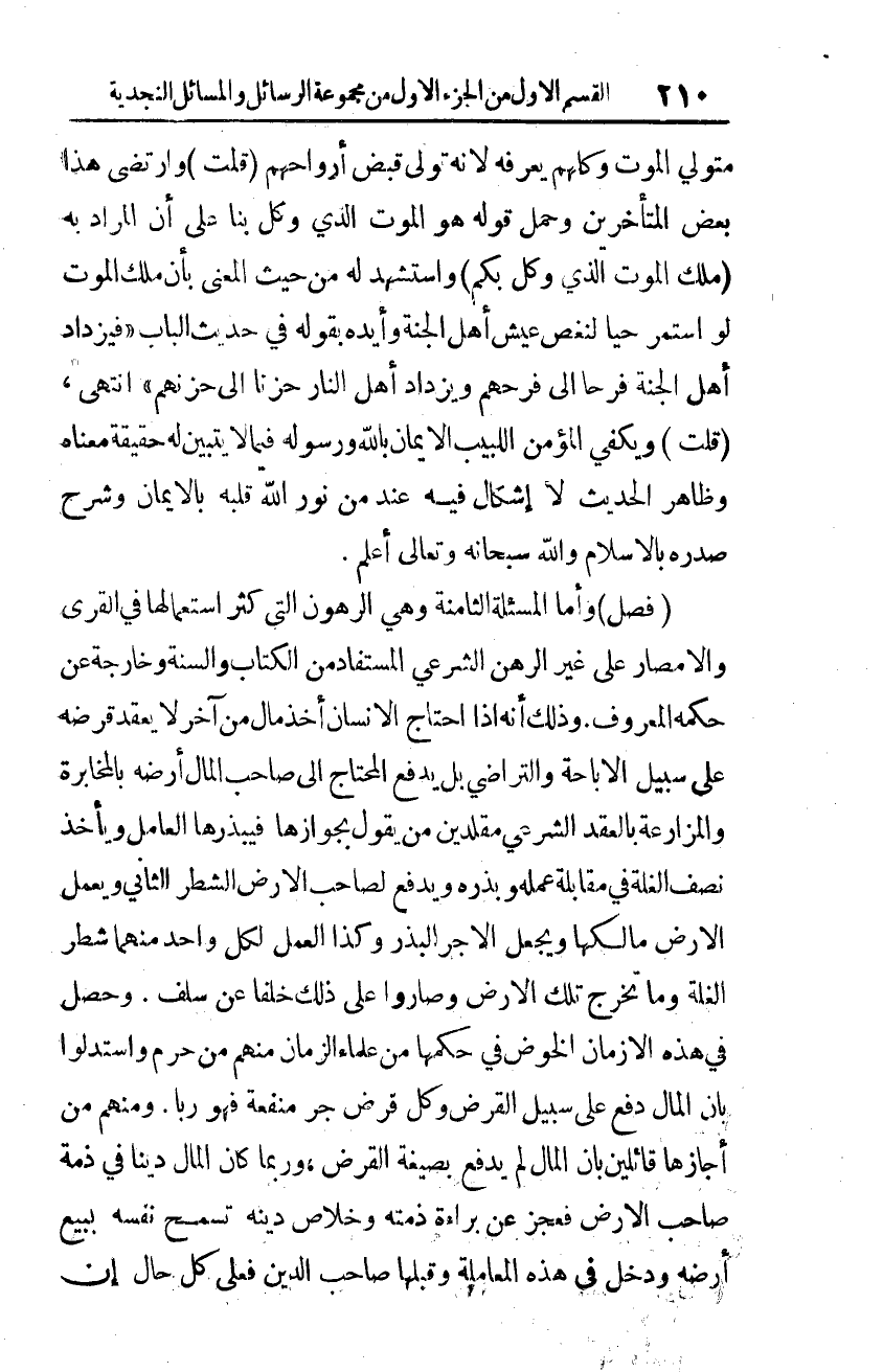 (فصل): وأمّا المسألة الثّامنة؛ وهي الرّهون التي كثر استعمالها في القرى والأمصار على غير الرّهن الشّرعي المستفاد من الكتاب والسّنة وخارجة عن حكمه المعروف. وذلك أنّه إذا احتاج الإنسان أخذ مال من آخر لا يعقد قرضه على سبيل الإباحة والتّراضي بل يدفع المحتاج إلى صاحب المال أرضه بالمخابرة والمزارعة بالعقد الشّرعي مقلدين من يقول بجوازها فيبذرها العامل ويأخذ نصف الغلة في مقابلة عمله وبذره، ويدفع لصاحب الأرض الشّطر الثّاني ويعمل الأرض مالكها ويجعل الأجر البذر، وكذا العمل لكلّ واحدٍ منهما شطر الغلة، وما تخرج تلك الأرض، وصاروا على ذلك خلفًا عن سلف. وحصل في هذه الأزمان الخوض في حكمها من علماء الزّمان منهم من حرم واستدلوا بأنّ المال دفع على سبيل القرض، وكلّ قرض جرّ منفعةٍ فهو ربا.