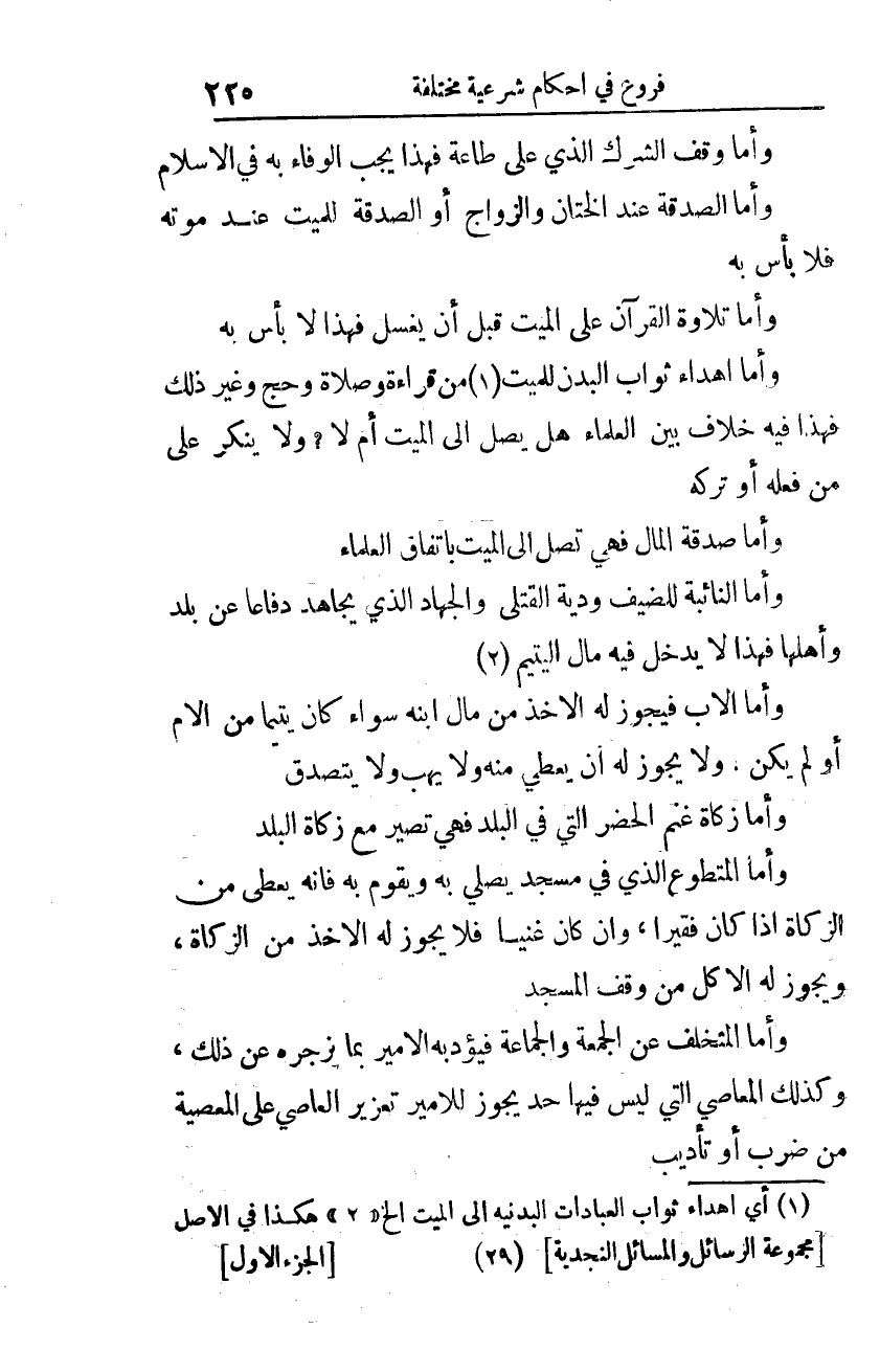 وأمّا إهداء ثواب البدن للميّت 1 من قراءةٍ، وصلاةٍ، وحجٍّ وغير ذلك، فهذا فيه خلاف بين العلماء هل يصل إلى الميّت أم لا؟ ولا ينكر على مَن فعله أو تركه.