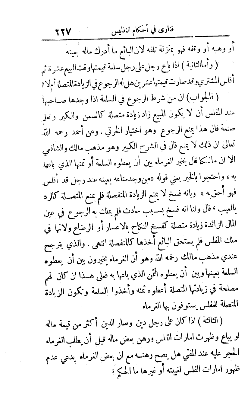 (فالجواب): أنّ من شرط الرّجوع في السّلعة إذا وجدها صاحبها عند المفلس أن لا يكون المبيع زاد زيادة متّصلة، كالسّمن، والكبر، وتعلّم صنعةٍ، فإنّ هذا يمنع الرّجوع، وهو اختيار الخرقي. وعن أحمد -رحمه الله تعالى- إنّ ذلك لا يمنع. قال في الشّرح الكبير، وهو مذهب مالك، والشّافعي، إلّا أنّ مالكًا قال: يخيّر الغرماء بين أن يعطوه السّلعة أو ثمنها الذي باعها به، واحتجّوا بالخبر يعني قوله: "مَن وجد متاعه بعينه عند رجلٍ قد أفلس فهو أحقّ به"، وبأنّه فسخ لا يمنع الزّيادة المنفصلة فلم يمنع المتّصلة كالرّدّ بالعيب.