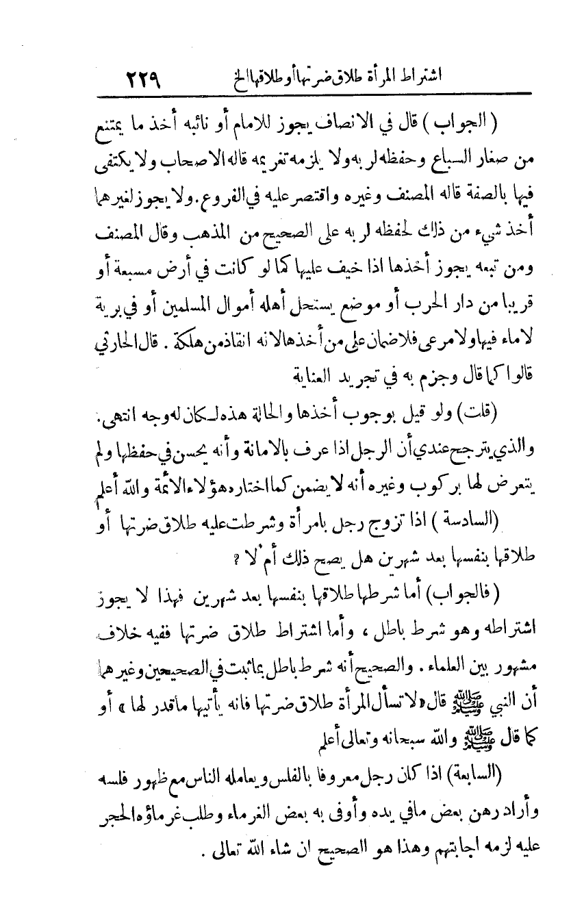 (الجواب): قال في الإنصاف: يجوز للإمام أو نائبه أخذ ما يمتنع من صغار السّباع وحفظه لربّه، ولا يلزمه تغريمه. قاله الأصحاب، ولا يكتفى فيها بالصّفة. قاله المصنّف وغيره، واقتصر عليه في الفروع. ولا يجوز لغيرهما أخذ شيء من ذلك لحفظه لربّه على الصّحيح من المذهب. وقال المصنّف ومَن تبعه يجوز أخذها إذا خيف عليها كما لو كانت في أرض مسبّعة أو قريبًا من دار الحرب، أو موضع يستحلّ أهله أموال المسلمين، أو في برية لا ماء فيها ولا مرعى فلا ضمان على مَن أخذها؛ لأنّه إنقاذ من هلكة. قال الحارثي: قالوا كما قال. وجزم به في تجريد العناية.