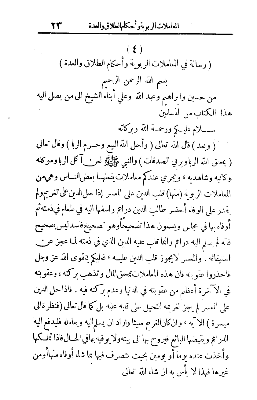 (رسالة في المعاملات الربوية وأحكام الطلاق والعدة)