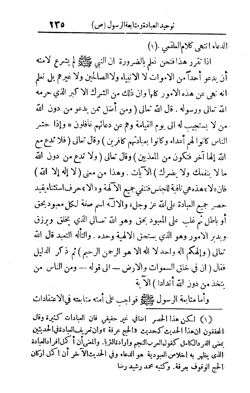 1 لكن هذا الحصر إضافي غير حقيقي؛ فإنّ العبادات كثيرة، وقال المحقّقون: إنّ هذا الحديث كحديث: "الحجّ عرفة"، وإنّ تعريف العبادة في الحديثين بمعنى الفرد الكامل؛ كقول العرب: النّجم، وأراد الثّريا. والمعنى: أنّ أكمل إفراد العبادة الذي يظهر به إخلاص العبودية هو الدّعاء، وفي الحديث الآخر أنّ أكمل أركان الحجّ الوقوف بعرفة. وكتبه محمّد رشيد رضا.