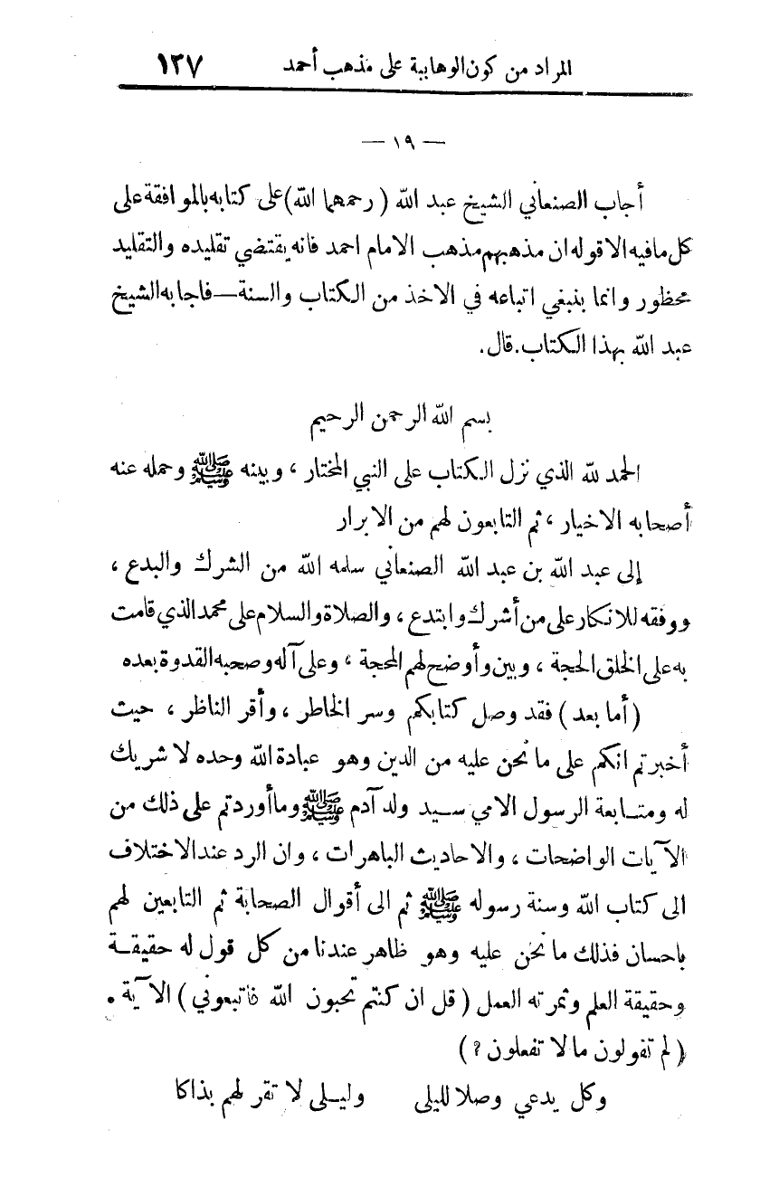 إلى عبد الله بن عبد الله الصّنعاني، سلّمه الله من الشّرك والبدع، ووفّقه للإنكار على مَن أشرك وابتدع، والصّلاة والسّلام على محمّد الذي قامت به على الخلق الحجة، وبيّن وأوضح لهم المحجة، وعلى آله وصحبه القدوة بعده.