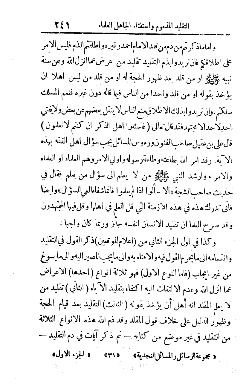 وأمّا ما ذكرتم من ذمّ مَن قلّد الإمام أحمد وغيره، وأطلقتم الذّمّ فليس الأمر على إطلاقكم، فإن تريدون بذمّ التّقليد تقليد مَن أعرض عما أنزل الله، وعن سنة نبيّه -صلّى الله عليه وسلّم-، أو مَن قلّد بعد ظهور الحجة له، أو مَن قلّد مَن ليس أهلًا أن يؤخذ بقوله، أو مَن قلّد واحدًا من النّاس فيما قاله دون غيره، فنعم المسلك سلكتم.
