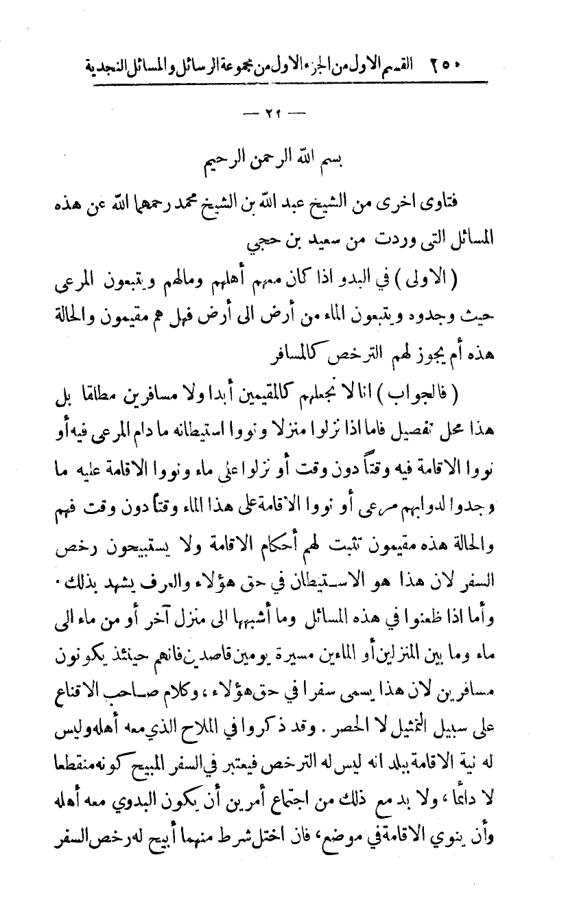الأولى: في البدو إذا كان معهم أهلهم ومالهم ويتّبعون المرعى حيث وجدوه ويتّبعون الماء من أرضٍ إلى أرضٍ، فهل هم مقيمون والحالة هذه أم يجوز لهم التّرخّص كالمسافر؟