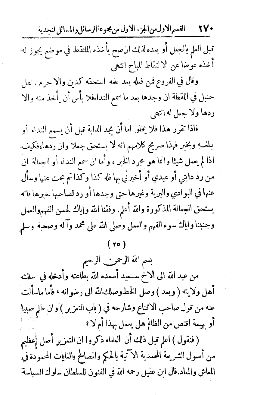 وصل الخط وصلك الله إلى رضوانه، فأمّا ما سألت عنه من قول صاحب الإقناع وشارحه في (باب التّعزير): وإن ظلم صبيًا أو بهيمة اقتصّ من الظّالم، هل يعمل بهذا أم لا؟