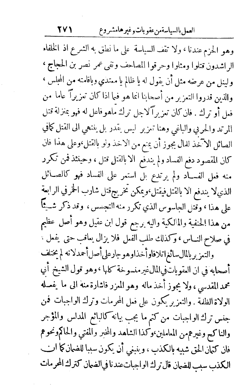 وهو الحزم عندنا، ولا تقف السّياسة على ما نطق به الشّرع إذ الخلفاء الرّاشدون قتلوا ومثّلوا وحرقوا المصاحف ونفى عمر نصر بن الحجاج، ولينل من عرضه مثل أن يقول له: يا ظالم، يا معتدي، وبإقامته من المجلس، والذين قدروا التّعزير من أصحابنا إنّما هو فيما إذا كان تعزيرًا عامًا من فعلٍ أو تركٍ. فإن كان تعزيرًا لأجل ترك ما هو فاعلٍ له فهو بمنْزلة قتل المرتدّ والحربي والباغي، وهنا تعزير ليس يقدر بل ينتهي إلى القتل كما في الصّائل الآخذ للمال يجوز أن يمنع مع الأخذ ولو بالقتل، وعلى هذا فإن كان المقصود دفع الفساد ولم يرتدع بل استمرّ على الفساد فهو كالصّائل الذي لا يندفع إلّا بالقتل فيتقل، ويمكن منه التّجسس، وقد ذكر شيئًا من هذا الحنفية والمالكية وإليه يرجع قول ابن عقيل: وهو أصل عظيم في صلاح النّاس، وكذا طلب الفعل فلا يزال يعاقب حتّى يفعل.