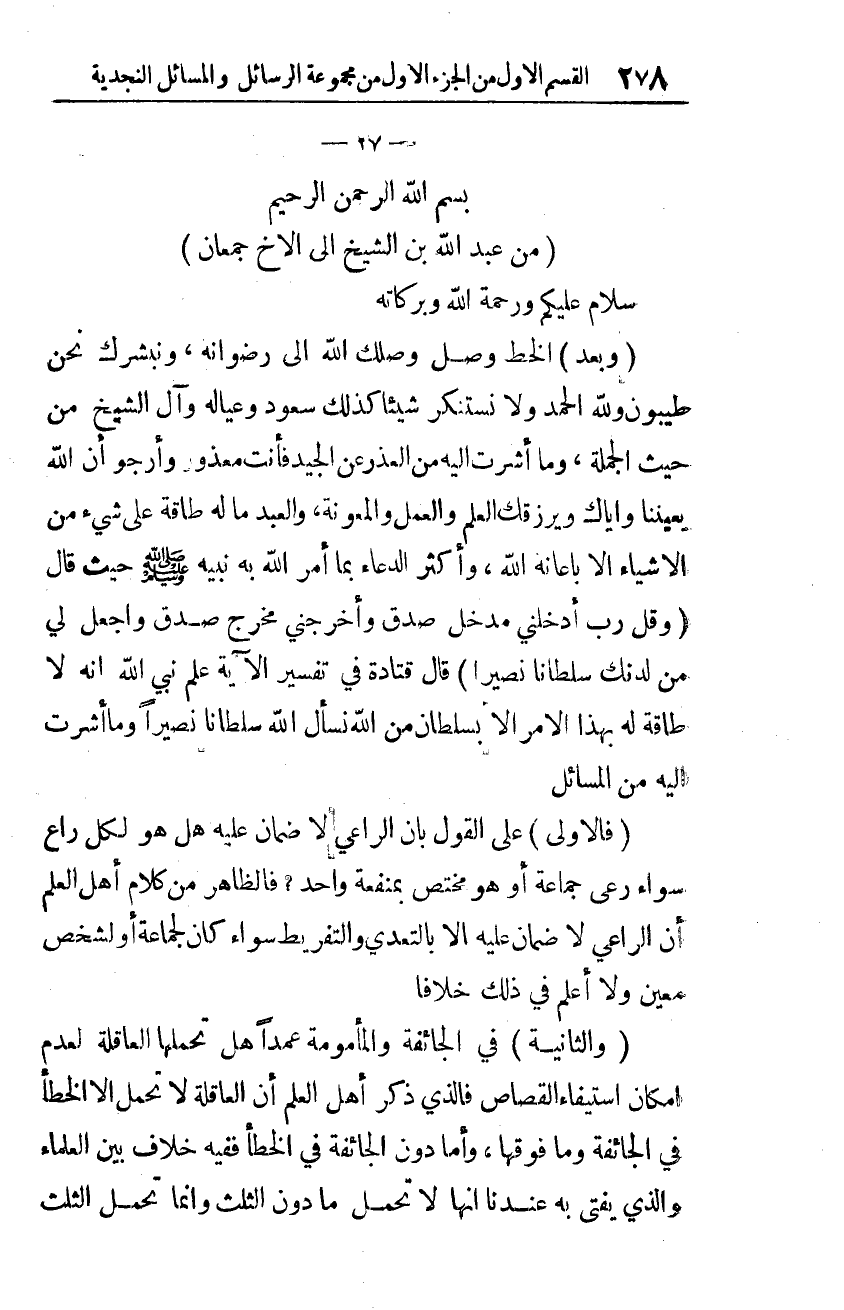 الخط وصل وصلك الله إلى رضوانه، ونبشّرك نحن طيّبون -ولله الحمد- ولا نستنكر شيئًا، كذلك سعود وعياله وآل الشّيخ من حيث الجملة. وما أشرت إليه من العذر عن الجيد فأنت معذور، وأرجو أنّ الله يعيننا وإيّاك ويرزقك العلم والعمل والمعونة، والعبد ما له طاقة على شيء من الأشياء إلّا بإعانة الله، وأكثر الدّعاء بما أمر الله به نبيّه -صلّى الله عليه وسلّم- حيث قال: {وَقُلْ رَبِّ أَدْخِلْنِي مُدْخَلَ صِدْقٍ وَأَخْرِجْنِي مُخْرَجَ صِدْقٍ وَاجْعَلْ لِي مِنْ لَدُنْكَ سُلْطَانًا نَصِيرًا}، [الإسراء: 80]. قال قتادة في تفسير الآية: علّم نَبِيّ الله أنّه لا طاقة له بهذا الأمر إلّا بسلطان من الله نسأل الله سلطانًا نصيرًا. وما أشرت إليه من المسائل: