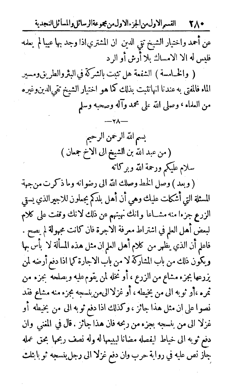 وصل الخط وصلك الله إلى رضوانه، وما ذكرت من جهة المسألة التي أشكلت عليك؛ وهي: أنّ أهل بلدكم يجعلون للأجير الذي يسقي الزّرع جزءًا منه مشاعًا، وأنّك نهيتهم عن ذلك؛ لأنّك وقفت على كلامٍ لبعض أهل العلم في اشتراط معرفة الأجرة، فإن كانت مجهولة لم يصحّ.