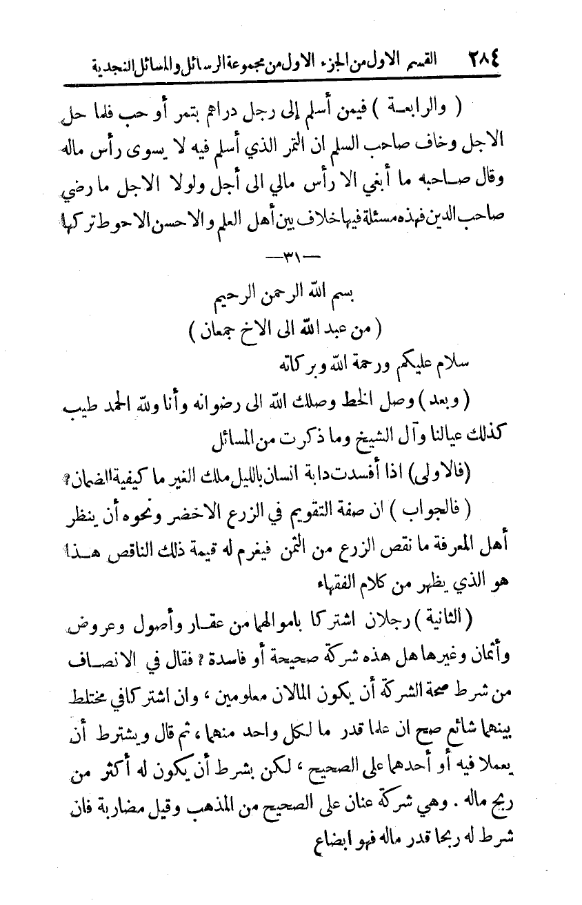 وصل الخط وصلك الله إلى رضوانه. وأنا ولله الحمد طيّب، كذلك عيالنا وآل الشّيخ. وما ذكرت من المسائل:
