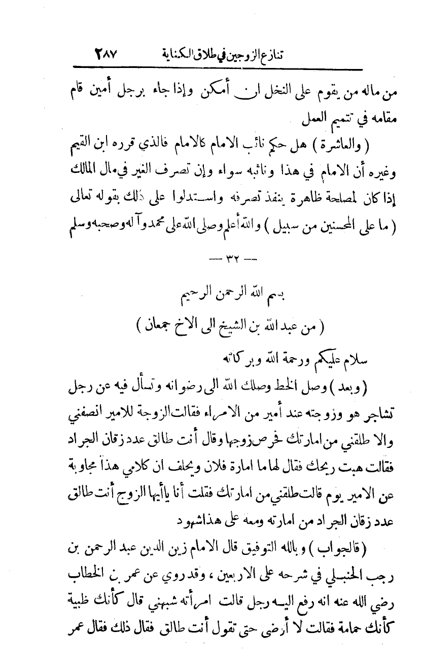 وصل الخط وصلك الله إلى رضوانه، وتسأل فيه عن رجلٍ تشاجر هو وزوجته عند أميرٍ من الأمراء، فقالت الزّوجة للأمير: أنصفنِي وإلّا طلّقنِي من إمارتك، فحرص زوجها وقال: أنتِ طالق عدد زقان الجراد، فقالت: هبت ريحك، فقال لها: ما إمارة فلان، ويحلف أنّ كلامي هذا مجاوبة عن الأمير يوم قالت: طلّقنِي من إمارتك، فقلت أنا: يا أيّها الزّوج، أنت طالق عدد زقان الجراد من إمارته، ومعه على هذا شهود.