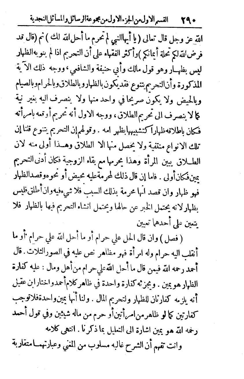 الله -عزّ وجلّ- قال تعالى: {يَا أَيُّهَا النَّبِيُّ لِمَ تُحَرِّمُ مَا أَحَلَّ اللَّهُ لَكَ}، [التّحريم، من الآية: 1]، ثم قال: {قَدْ فَرَضَ اللَّهُ لَكُمْ تَحِلَّةَ أَيْمَانِكُمْ}، [التّحريم، من الآية: 2]. وأكثر الفقهاء على أنّ التّحريم إذا لم ينويه الظّهار ليس بظهار، وهو قول مالك وأبي حنيفة والشّافعي، ووجه ذلك الآية المذكورة. وأنّ التّحريم يتنوّع فقد يكون بالظّهار وبالطّلاق وبالحرام وبالصّيام وبالحيض، ولا يكون صريحًا في واحدٍ منها، ولا ينصرف إليه بغير نيّةٍ كما لا ينصرف إلى تحريم الطّلاق، ووجه الأوّل: أنّه تحريم أوقعه بامرأته فكان بإطلاقه ظهارًا كتشبيهها بظهر أمّه. وقولهم: إنّ التّحريم يتنوّع قلنا: إنّ تلك الأنواع منتفية ولا يحصل منها إلّا الطّلاق. وهذا أولَى منه؛ لأنّ الطّلاق يُبَيِّن المرأة، وهذا يحرّمها مع بقاء الزّوجية، فكان أدنى التّحريم يمين فكان أولى.