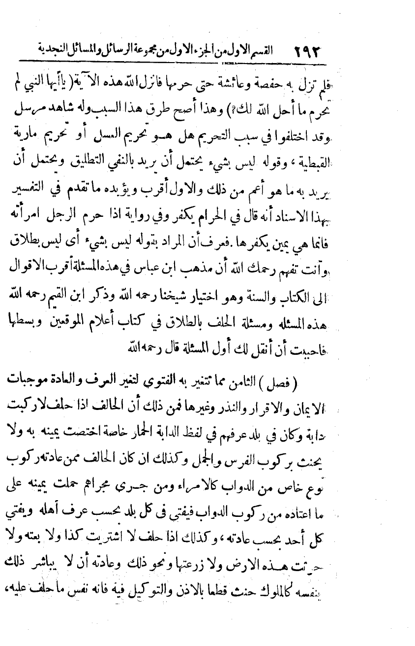 وقد اختلف في سبب التّحريم هل هو تحريم العسل، أو تحريم مارية القبطية، وقوله: ليس بشيء، يحتمل أن يريد بالنَّفي التّطليق، ويحتمل أن يريد به ما هو أعم من ذلك، والأوّل أقرب ويؤيّده ما تقدم في التّفسير بهذا الإسناد أنّه قال في الحرام يكفر، وفي روايةٍ إذا حرم الرّجل امرأته فإنّما هي يمين يكفّرها. فعرف أنّ المراد بقوله: ليس بشيء، أي: ليس بطلاق وأنت تفهم -رحمك الله- أنّ مذهب ابن عبّاس في هذه المسألة أقرب الأقوال إلى الكتاب والسّنة، وهو اختيار شيخنا -رحمه الله-. وذكر ابن القيم -رحمه الله- هذه المسألة ومسألة الحلف بالطّلاق في كتاب أعلام الموقعّين وبسطها فأحببت أن أنقل لك أوّل المسألة قال -رحمه الله-: