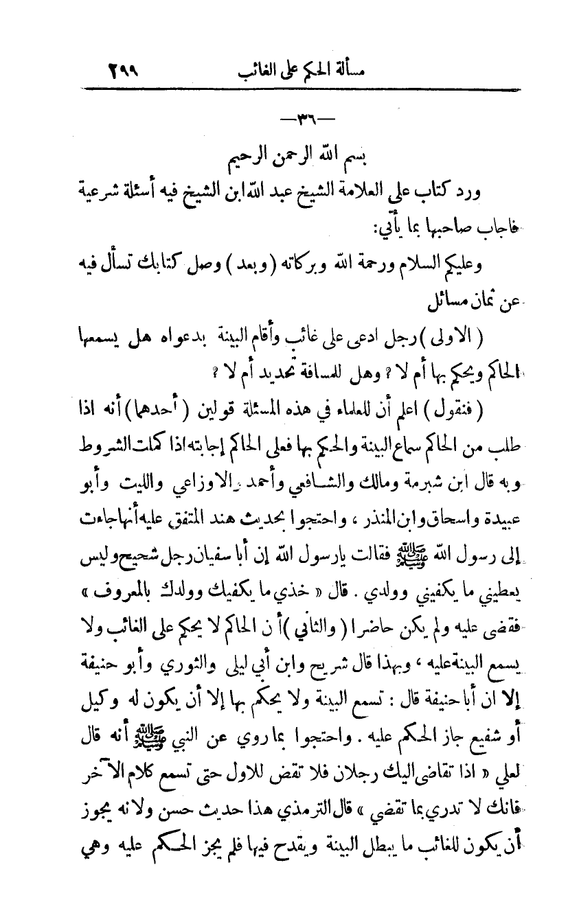 ورد كتاب على العلامة الشّيخ عبد الله بن الشّيخ فيه أسئلة شرعية فأجاب صاحبها بما يأتي: