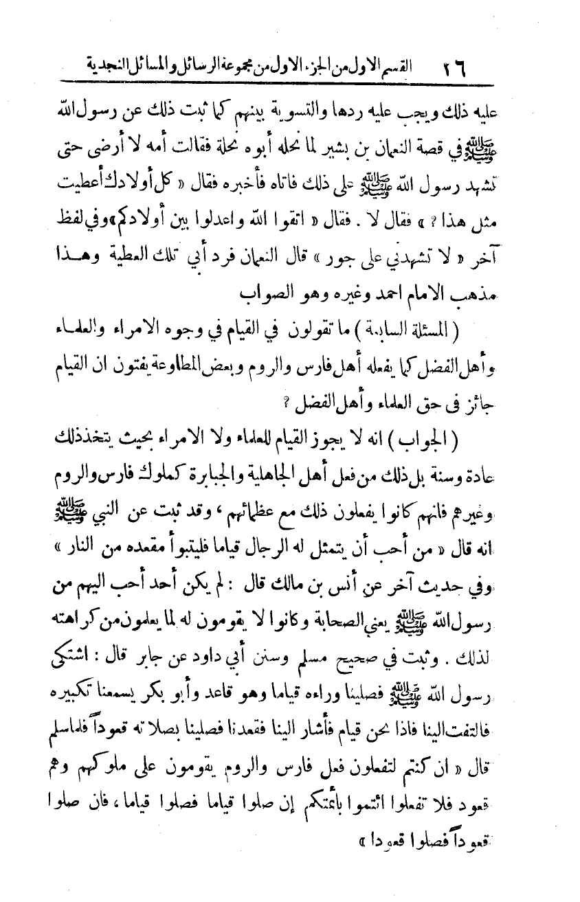 (المسألة السابعة): ما تقولون في القيام في وجوه الأمراء، والعلماء، وأهل الفضل كما يفعله أهل فارس، والروم، وبعض المطاوعة يفتون أن القيام جائز في حق العلماء، وأهل الفضل؟