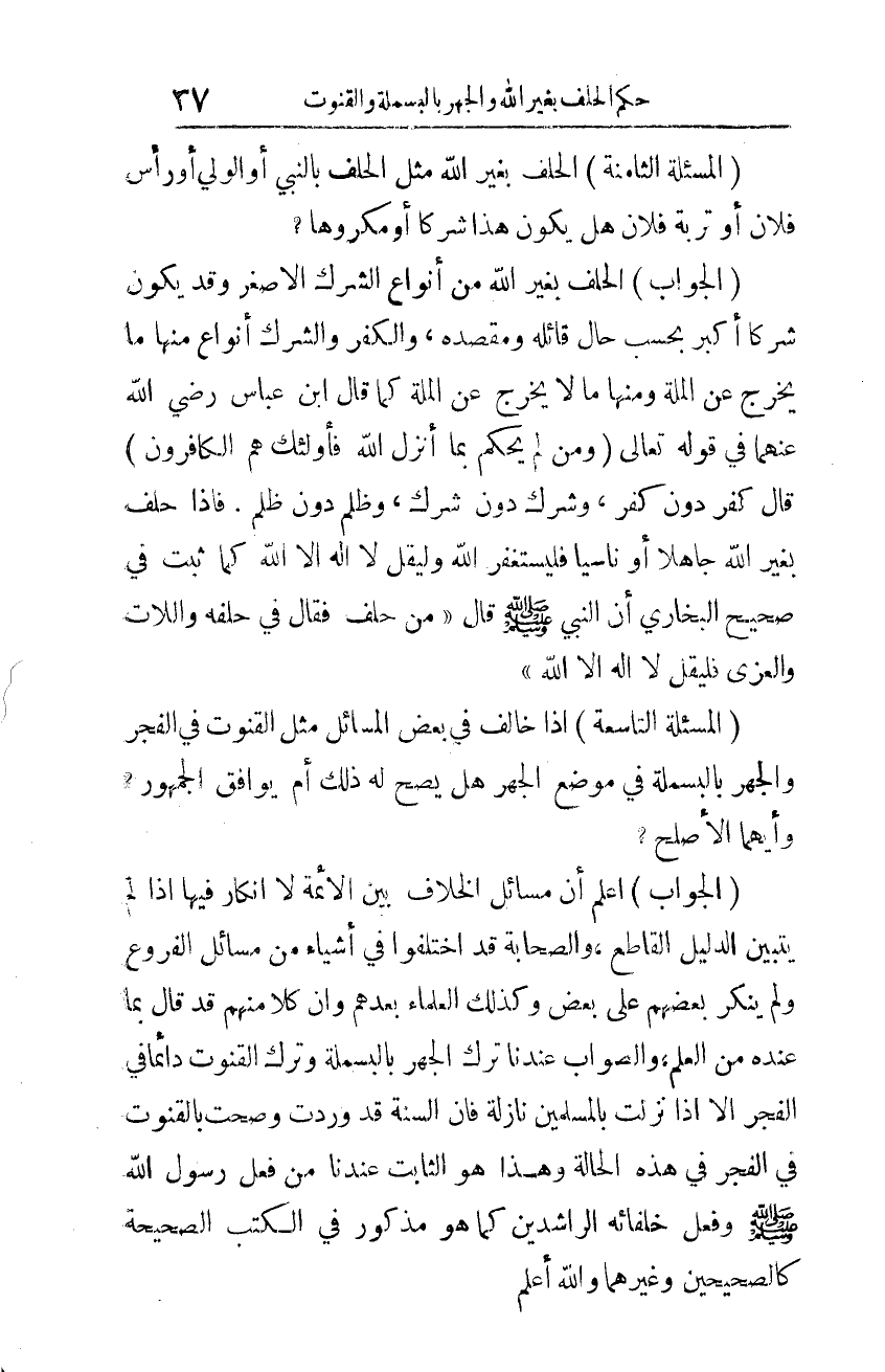 (الجواب): اعلم أن مسائل الخلاف بين الأئمة لا إنكار فيها إذا لم يُتَبَيّنْ الدليل القاطع، والصحابة قد اختلفوا في أشياء من مسائل الفروع، ولم ينكر بعضهم على بعض، وكذلك العلماء بعدهم، وأن كلا منهم قد قال بما عنده من العلم؛ والصواب عندنا ترك الجهر بالبسملة، وترك القنوت دائما في الفجر إلا إذا نزلت بالمسلمين نازلة؛ فإن السنة قد وردت، وصحت بالقنوت في الفجر في هذه الحالة. وهذا هو الثابت عندنا من فعل رسول الله -صلى الله عليه وسلم- وفعل خلفائه الراشدين كما هو مذكور في الكتب الصحيحة كالصحيحين، وغيرهما. والله أعلم.
