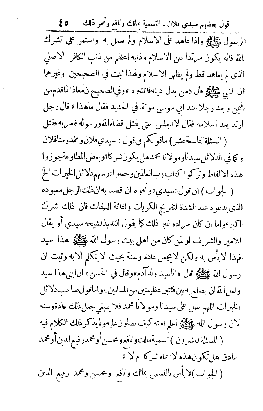 (المسألة التاسعة عشر): ما قولكم في قول: سيدي فلان، ومخدومنا فلان، وكما في الدلائل سيدنا، ومولانا محمد، هل يكون شركا؟ وبعض المطاوعة جوزوا هذه الألفاظ، وتركوا كتاب رب العالمين، وجعلوا درسهم دلائل الخيرات إلخ.