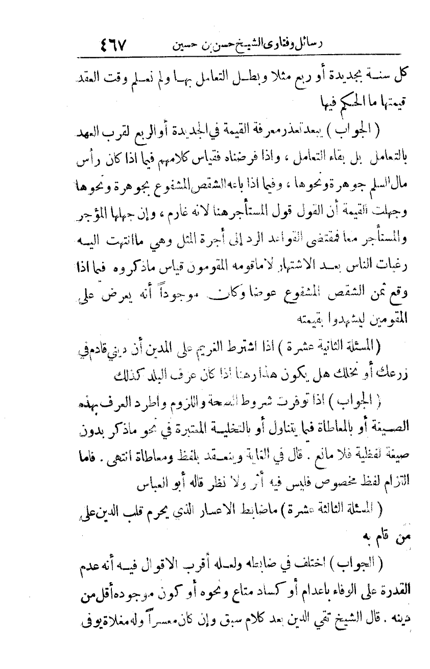 الجواب: يبعد تعذر معرفة القيمة في الجديدة أو الرّبع لقرب العهد بالتّعامل بل بقاء التّعامل، وإذا فرضناه فقياس كلامهم فيما إذا كان رأس مال السّلم جوهرة ونحوها، وفيما إذا باعه الشّقص المشفوع بجوهرة ونحوها وجهلت القيمة أنّ القول قول المستأجر هنا؛ لأنّه غارم، وإن جهلها المؤجّر والمستأجر معًا فمقتضى القواعد الرّد إلى أجرة المثل، وهي ما انتهت إليه رغبات النّاس بعد الاشتهار لا ما قوّمه المقوّمون قياس ما ذكروه فيما إذا وقع ثمن الشقص المشفوع عوضًا وكان موجودًا أنّه يعرض على المقوّمين ليشهدوا بقيمته.