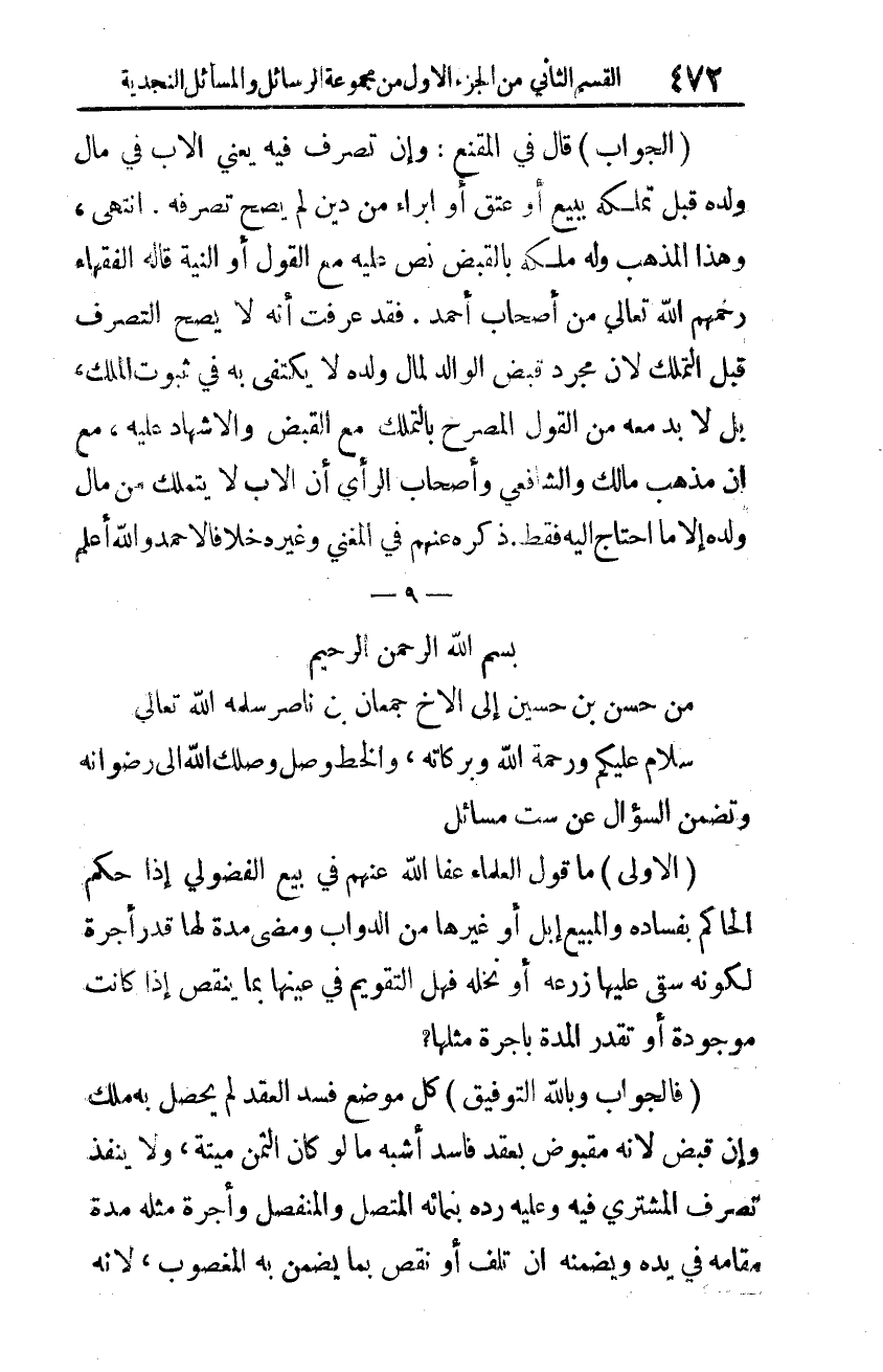 والخط وصل وصلك الله إلى رضوانه وتضمّن السّؤال عن ستّ مسائل: