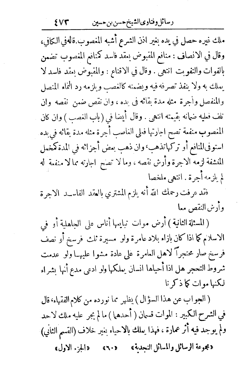 المسألة الثّانية: أرض موات تبايعها أناس على الجاهلية أو في الإسلام كما إذا كان بإزاء بلاد عامرة ولو مسيرة ثلث فرسخ أو نصف فرسخ صار محتجرًا لأهل العامرة على عادة مشوا عليها ولو عدمت شروط التّحجّر هل إذا أحياها إنسان يملكها ولو ادّعى مدّعٍ أنّها بشراء لكنها موات كما ذكرنا.