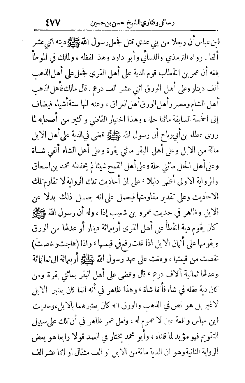 ابن عبّاس أنّ رجلًا من بنِي عدي قتل فجعل رسول الله -صلّى الله عليه وسلّم- ديته اثنَي عشر ألفا. رواه التّرمذي والنّسائي وأبو داود، وهذا لفظه. ولمالك في الموطأ بلغه أنّ عمر بن الخطاب قوّم الدّية على أهل القرى فجعل على أهل الذّهب ألف دينار وعلى أهل الورق اثني عشر ألف درهم. قال مالك: فأهل الذّهب أهل الشّام ومصر وأهل الورق أهل العراق. وعنه أنّها ستة أشياء فيضاف إلى الخمسة السّابقة مائتا حلّة. وهذا اختيار القاضي وكثير من أصحابه لما روى عطاء بن أبي رباح أنّ رسول الله -صلّى الله عليه وسلّم- قضى في الدّية على أهل الإبل مائة من الإبل، وعلى أهل البقر مائتي بقرة، وعلى أهل الشّاء ألفي شاة، وعلى أهل الحلل مائتي حلة، وعلى أهل القمح شيئًا لم يحفظه محمّد بن إسحاق والرّواية الأولى أظهر دليلًا على أنّ أحاديث تلك الرّواية لا تقاوم تلك الأحاديث وعلى تقدير مقاومتها فيحمل على أنّه جعل ذلك بدلًا عن الإبل، وظاهر في حديث عمرو بن شعيب إذًا، وله أنّ رسول الله -صلّى الله عليه وسلّم- كان يقوّم على أثمان الخطأ على أهل القرى أربعمائة دينار أو عدلها من الورق ويقوّمها على أثمان الإبل إذا غلت رفع في قيمتها. وإذا "هاجت رخصت". نقصت من قيمتها، وبلغت على عهد رسول الله -صلّى الله عليه وسلّم- أربعمائة إلى ثمانمائة، وعدلها ثمانية آلاف درهم، قال: وقضى على أهل البقر بمائتي بقرة، ومَن كان دية عقله في شاء فألفا شاة، وهذا ظاهر في أنّه إنّما كان يعتبر الإبل لا غير، بل هو نصّ في الذّهب والورق، أنّه كان يعتبرهما بالإبل، وحديث ابن عبّاس واقعة عينٍ لا عموم له، وفعل عمر ظاهر في أنّ تلك على سبيل التّقويم فهو مؤيّد لما قلناه. وأبو محمّد يختار في العمد قولًا رابعًا هو بعض الرّواية الثّانية، وهو أنّ الدّية مائة من الإبل أو ألف مثقال أو اثنا عشر ألف