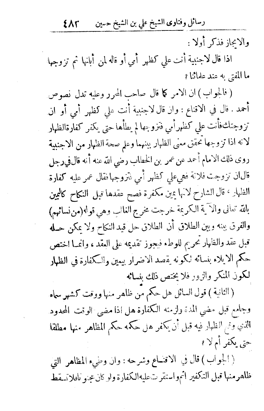 فالجواب: أنّ الأمر كما قال صاحب المحرّر وعليه تدلّ نصوص أحمد. قال في الإقناع: وإن قال لأجنبيّة أنتِ عليّ كظهر أمِّي أو إن تزوّجتك فأنت عليَّ كظهر أمِّي فتزوّجها لم يطأها حتّى يكفّر كفّارة الظّهار؛ لأنّه إذا تزوّجها تحقّق معنى الظّهار بينها وعلم صحّة الظّهار من الأجنبيّة. روى ذلك الإمام أحمد عن عمر بن الخطاب -رضي الله عنه- أنّه قال في رجلٍ قال: إن تزوّجت فلانة فهي علي كظهر أمِّي، فتزوّجها. فقال عمر: عليه كفّارة الظّهار. قال الشّارح: لأنّها يمين مكفِّرة فصحّ عقدها قبل النّكاح كاليمين بالله تعالى والآية الكريمة خرجت مخرج الغالب وهي قوله: {مِنْ نِسَائِهِمْ}، [الْمجادلة، من الآية: 2، و 3]. والفرق بينه وبين الطّلاق أنّ الطّلاق حلّ قيد النّكاح ولا يمكن حلّه قبل عقد والظّهار تحريم للوطء فيجوز تقديمه على العقد، وإنّما اختصّ حكم الإيلاء بنسائه لكونه يقصد الإضرار بيمين والكفّارة في الظّهار لكون المنكر والزّور فلا يختصّ ذلك بنسائه.