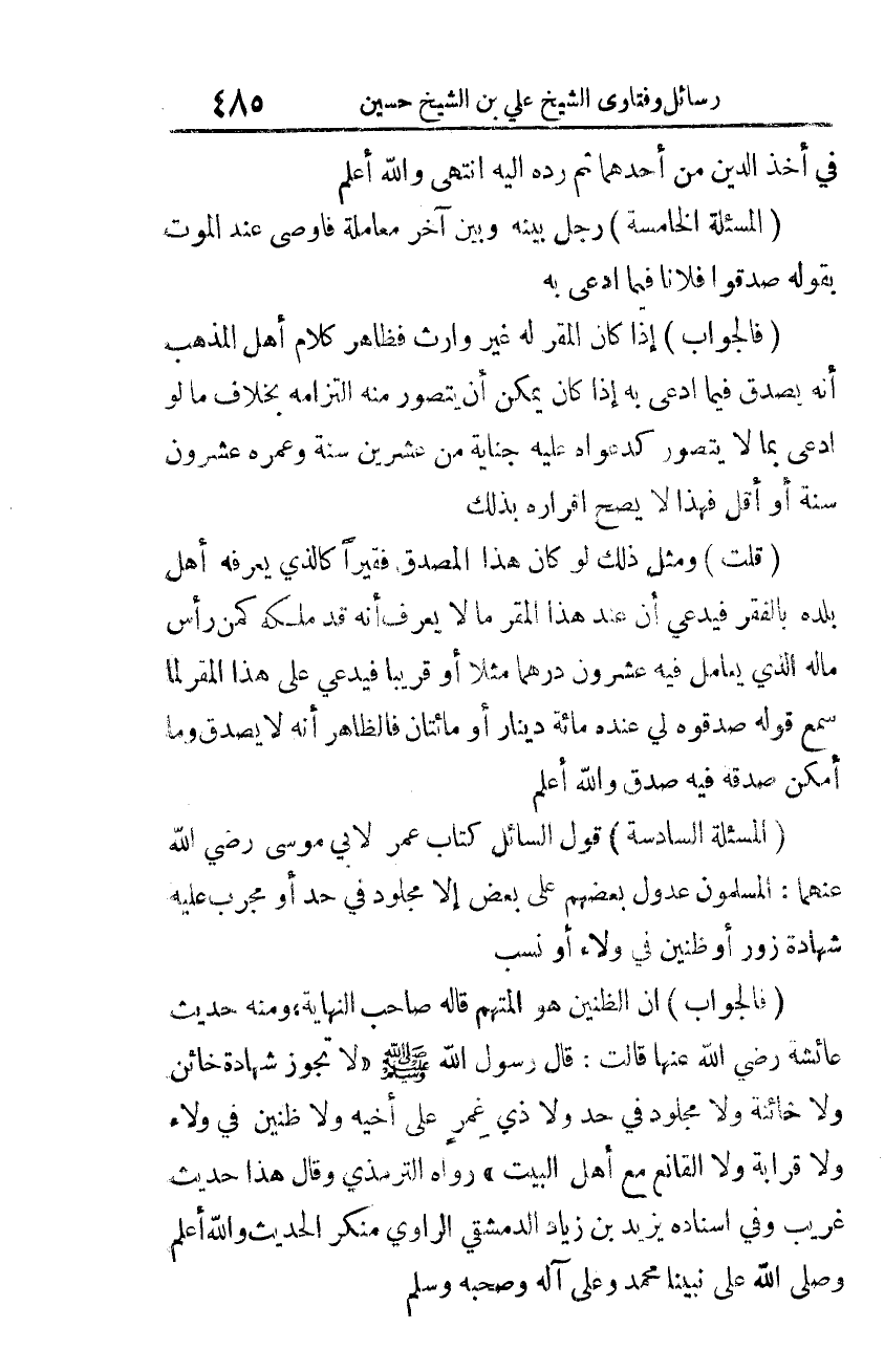 المسألة السّادسة: قول السّائل: كتاب عمر لأبي موسى -رضي الله عنهما- المسلمون عدول بعضهم على بعضٍ إلّا مجلود في حدٍ أو مجرّب عليه شهادة زورٍ أو ظنّين في ولاء أو نسب.